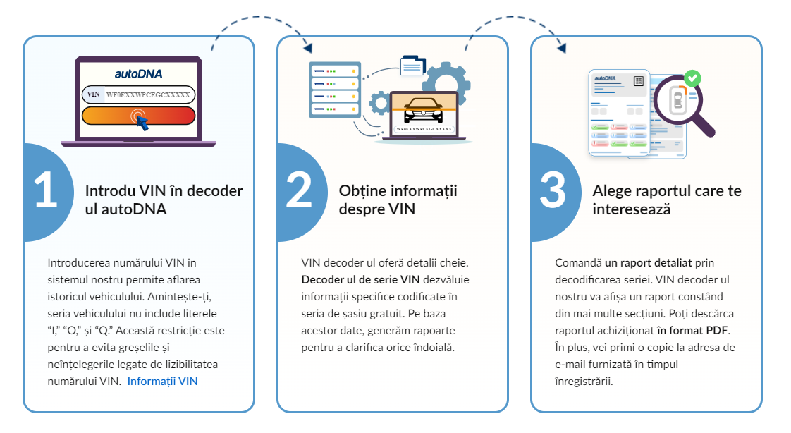 Este un instrument cu ajutorul căruia vei obține cele mai importante informații despre vehicul. Trebuie doar să urmezi trei pași pentru a obține informațiile disponibile despre vehicul, începând cu introducerea numărului VIN în decodor.